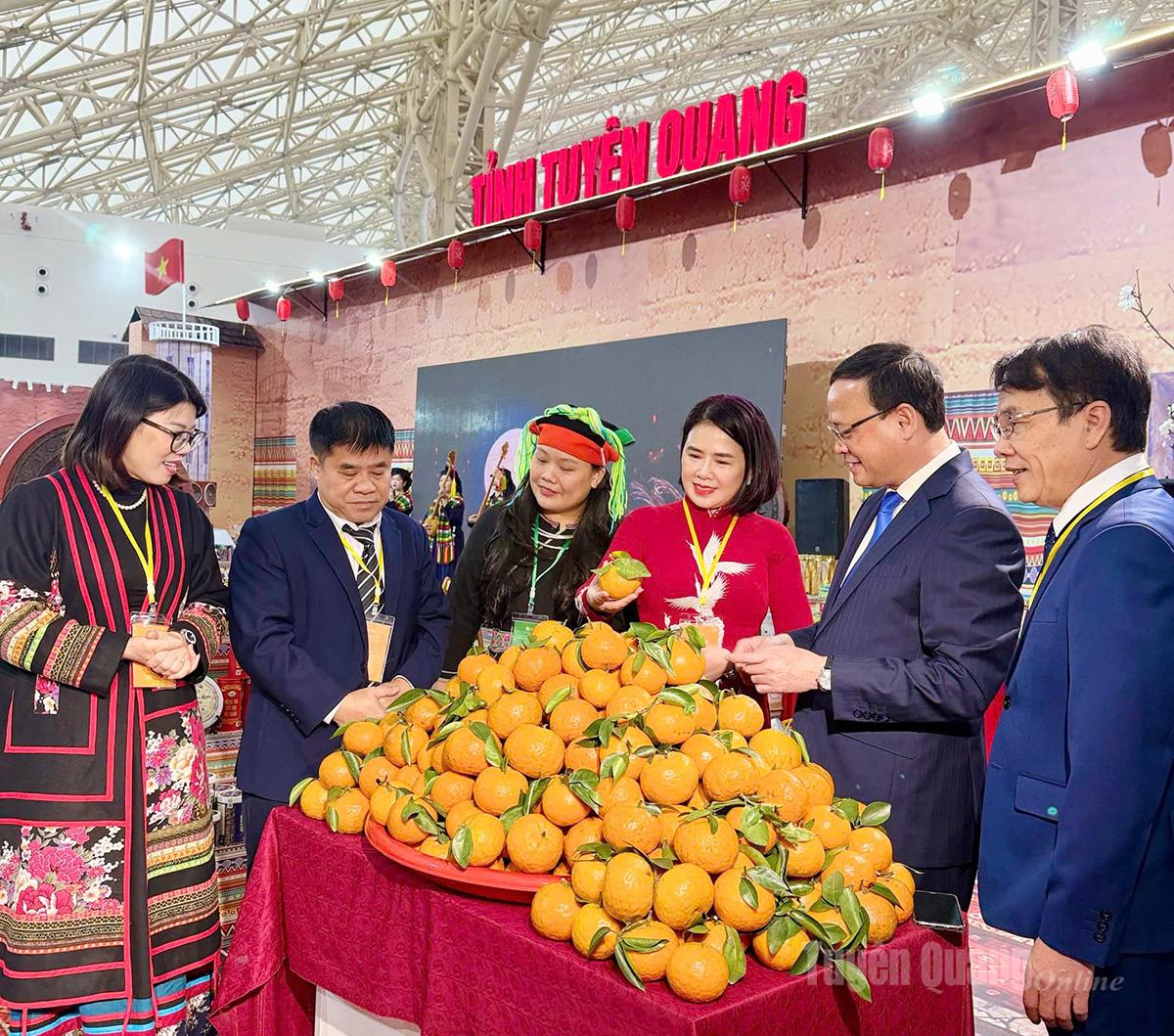 Đồng chí Phó Chủ tịch Thường trực UBND tỉnh Nguyễn Mạnh Tuấn tham quan gian hàng trưng bày cam sành của tỉnh.