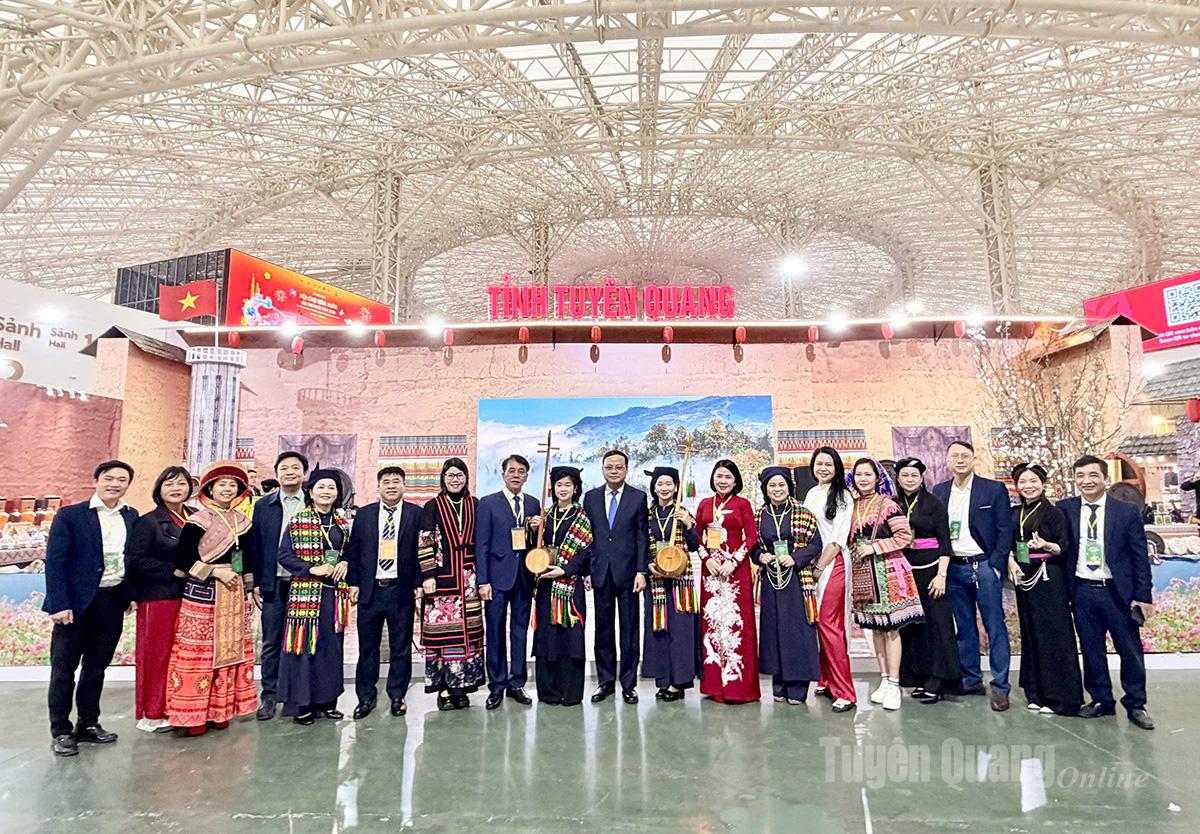 Đồng chí Phó Chủ tịch Thường trực UBND tỉnh Nguyễn Mạnh Tuấn cùng các đại biểu chụp ảnh lưu niệm trước không gian trưng bày của tỉnh Tuyên Quang tại Hội chợ Mùa Xuân 2026.