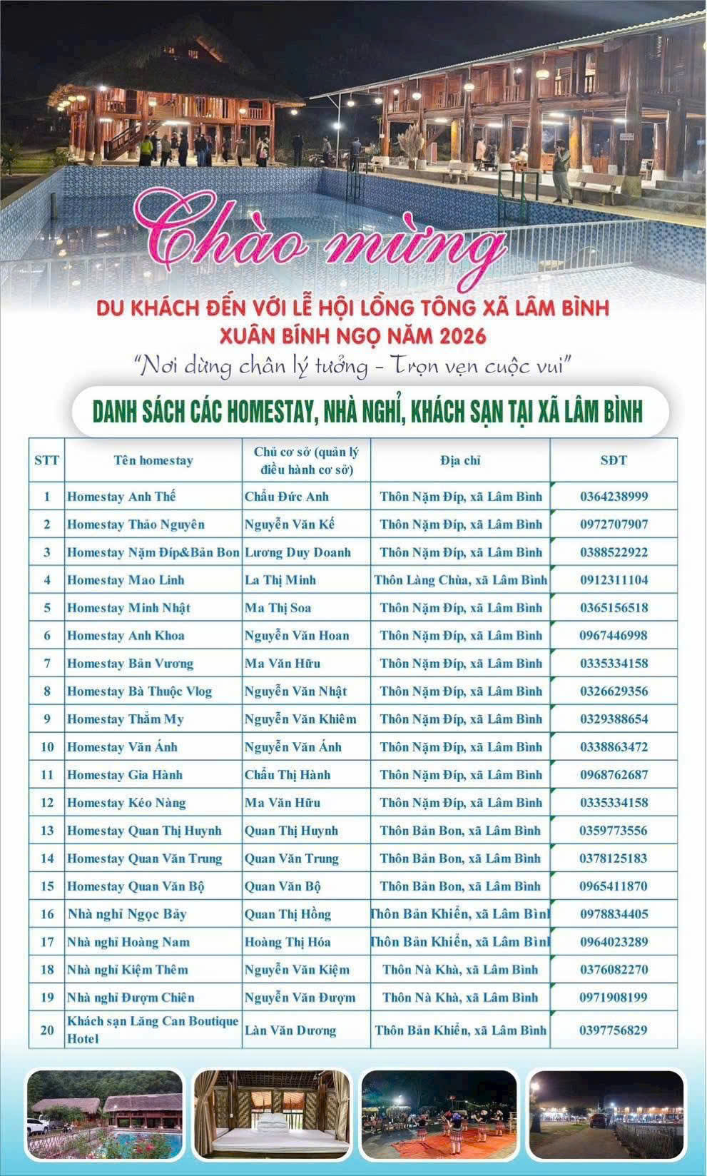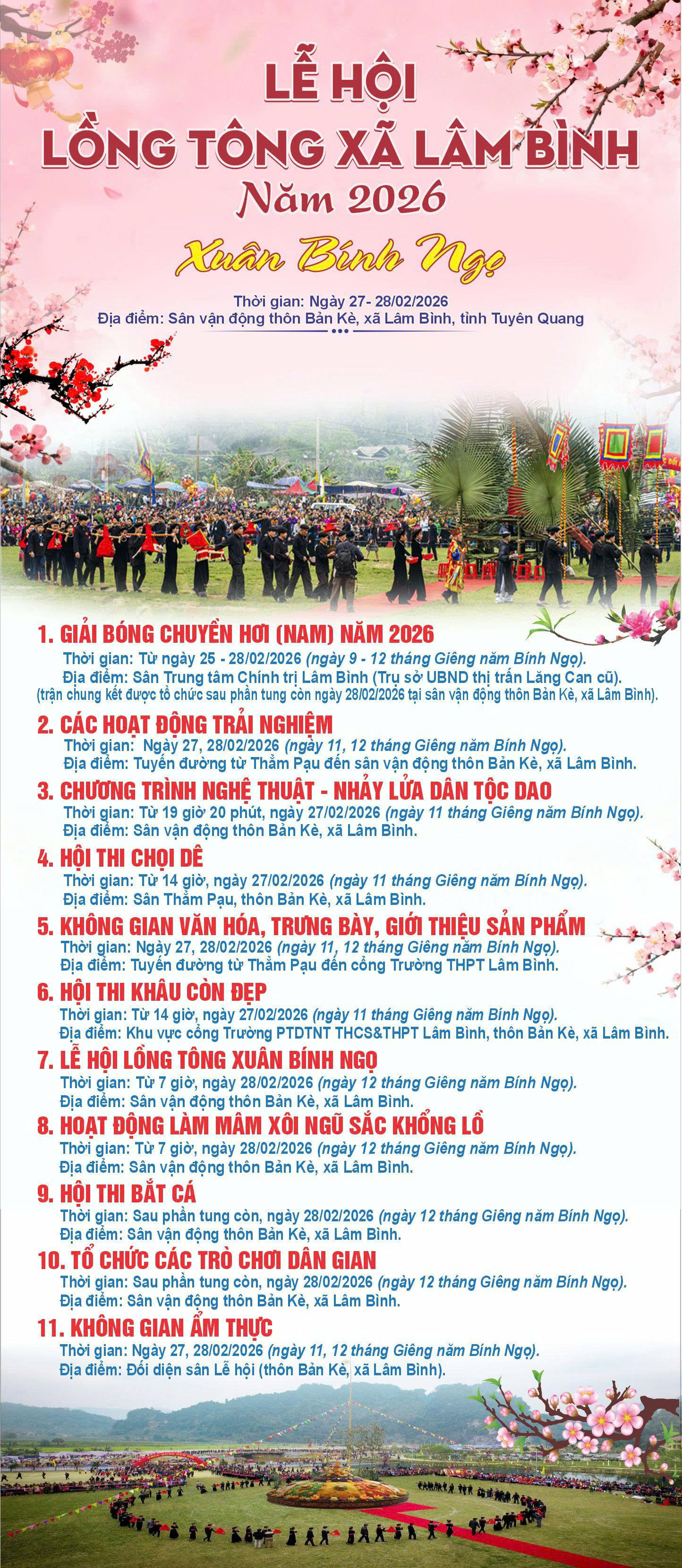 Lễ hội Lồng Tông (xuống đồng) xã Lâm Bình, Tuyên Quang Ngày đăng: Chủ nhật, 1/2/2026 - 14:32 Lượt xem: 25 Lễ hội Lồng Tông (xuống đồng) xã Lâm Bình, Tuyên Quang là di sản văn hóa phi vật thể quốc gia, được đồng bào Tày tổ chức vào đầu tháng Giêng (thường ngày 11-12 âm lịch) để cầu mùa màng bội thu và cuộc sống ấm no. Bài viết liên quan MỘT SỐ HOẠT ĐỘNG LỄ HỘI ĐẦU NĂM TẠI PHƯỜNG, XÃ TỈNH TUYÊN QUANG NĂM 2026 Thứ 4, 11/2/2026 - 8:47 KẾ HOẠCH TỔ CHỨC LỄ HỘI ĐỀN HẠ, ĐỀN THƯỢNG, ĐỀN Ỷ LA NĂM 2026 Thứ 5, 22/1/2026 - 9:44 LỄ HỘI GẦU TÀO XÃ ĐƯỜNG THƯỢNG NĂM 2026 – SẮC MÀU VĂN HÓA DÂN TỘC MÔNG GIỮA ĐẦU XUÂN Thứ 2, 19/1/2026 - 16:2
