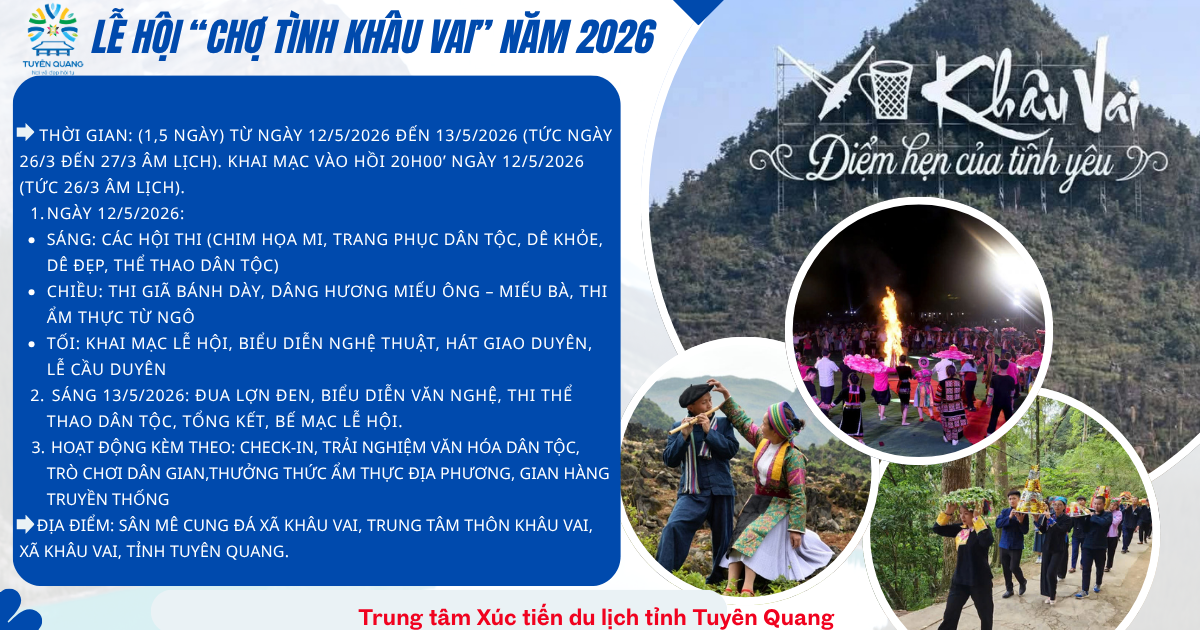 KẾ HOẠCH Tổ chức Lễ hội “Chợ tình Khâu Vai” năm 2026 Ngày đăng: Thứ 4, 8/4/2026 - 10:0 Lượt xem: 63 Lễ hội “Chợ tình Khâu Vai” năm 2026 là hoạt động văn hóa, du lịch, tạo điểm nhấn để giới thiệu, quảng bá hình ảnh địa phương, thu hút khách du lịch; tạo không gian văn hóa gắn kết cộng đồng, góp phần phát triển kinh tế - xã hội địa phương Bài viết liên quan Về Tuyên đi lễ đầu xuân Thứ 3, 7/4/2026 - 13:50 Đặc sắc Lễ rước Mẫu từ đền Ỷ La về đền Hạ năm 2026 Thứ 2, 30/3/2026 - 13:0 Chinh phục “Nóc nhà Đông Bắc” - Check in Hoa Đỗ Quyên Thứ 6, 13/3/2026 - 15:48
