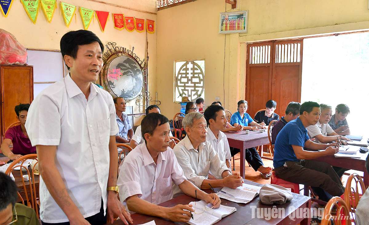 Đảng viên phát biểu tại buổi sinh hoạt thường kỳ tháng 8-2024 tại Chi bộ thôn Hưng Thịnh.