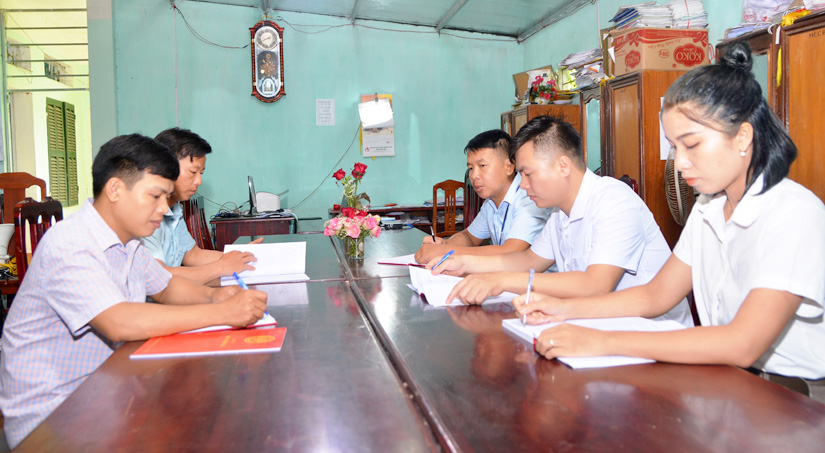 Lãnh đạo Đảng ủy xã Kiến Thiết nghe cán bộ, đảng viên được phân công phụ trách thôn bản báo cáo tình hình cơ sở.
