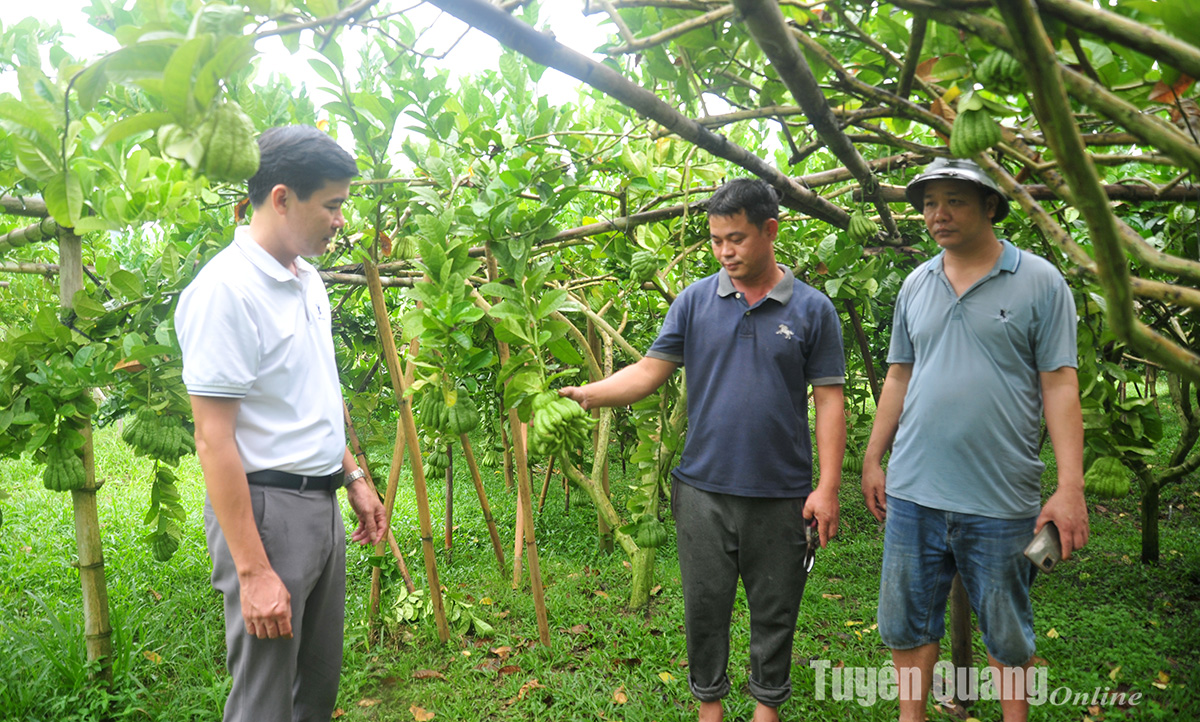 Cán bộ xã Yên Phú (bên trái ảnh) thăm mô hình trồng phật thủ của Nhân dân.