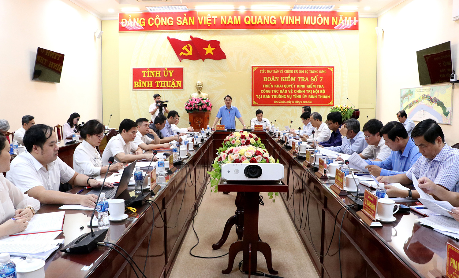 Đoàn kiểm tra số 7, Tiểu ban Bảo vệ chính trị nội bộ Trung ương do Phó Trưởng Ban Tổ chức Trung ương Phan Thăng An, Ủy viên Thường trực Tiểu ban làm trưởng đoàn, chủ trì Hội nghị công bố Quyết định triển khai kế hoạch kiểm tra công tác bảo vệ chính trị nội bộ tại Ban Thường vụ Tỉnh ủy Bình Thuận_Ảnh: TTXVN