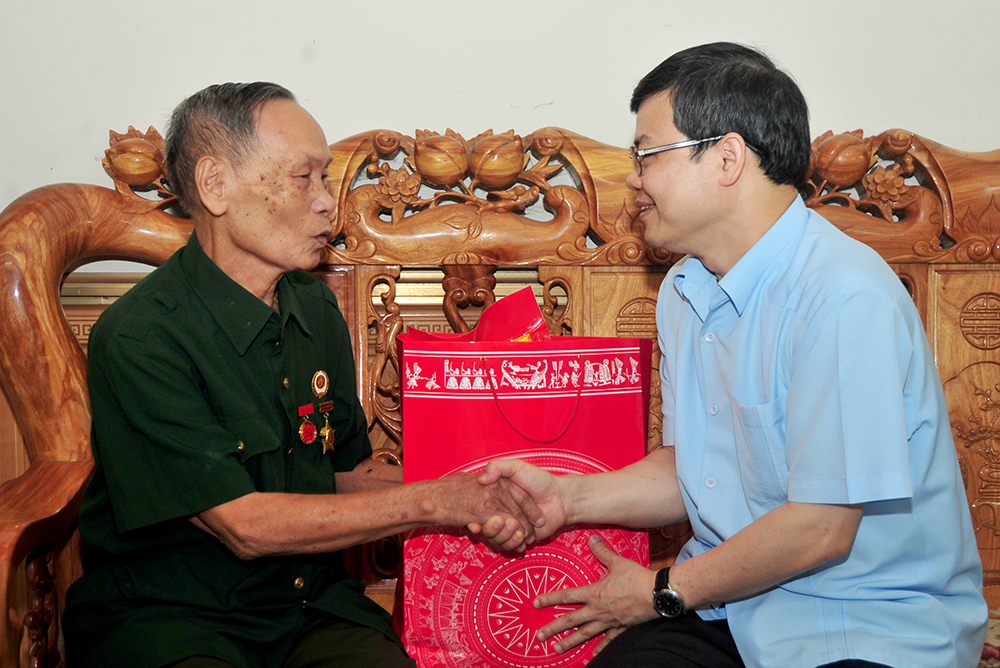 Đồng chí Chủ tịch UBND tỉnh Nguyễn Văn Sơn tặng quà ông Nguyễn Văn Đác, tổ 9 phường Ỷ La