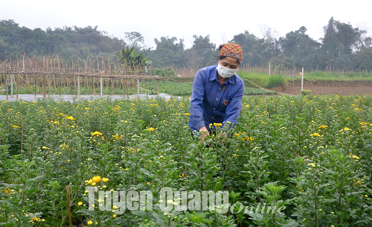 Bí thư Chi bộ thôn Liên Nghĩa Đoàn Phi Hùng dẫn chúng tôi tham quan bãi rau sạch Soi Hốc. Đây là vựa rau lớn nhất xã chuyên cung cấp cho chợ huyện. Tay tất bật thu hái lứa cà chua quá kỳ chín, bà Đào Thị Tuyên, thôn Liên Nghĩa cho biết, ông bà có tổng diện tích gần 5.000 m2 đất, trong đó có 3.000 m2 đất soi bãi và 2.000 m2 đất rừng. Ông bà dành toàn bộ đất soi trồng rau, thâm canh 4 vụ/năm. Năm ít cũng thu 7 đến 8 chục triệu, nhiều thì hơn trăm triệu đồng. Riêng năm vừa rồi rau được giá, sau khi trừ hết phân tro, ông bà dành dụm 90 triệu. “Mỗi sáng, vợ chồng tôi dậy từ 3 giờ sáng hái rau mang lên chợ Chiêm Hóa bán, 7-8 giờ về đến nhà chăn lợn gà, xong việc lại ra bãi làm rau. Làm rau vất vả nhưng thu nhập khá hơn các nghề khác. Trồng rau không chỉ nuôi sống được gia đình mà vợ chồng tôi còn nuôi được con học đại học” - bà Tuyên cười nói.