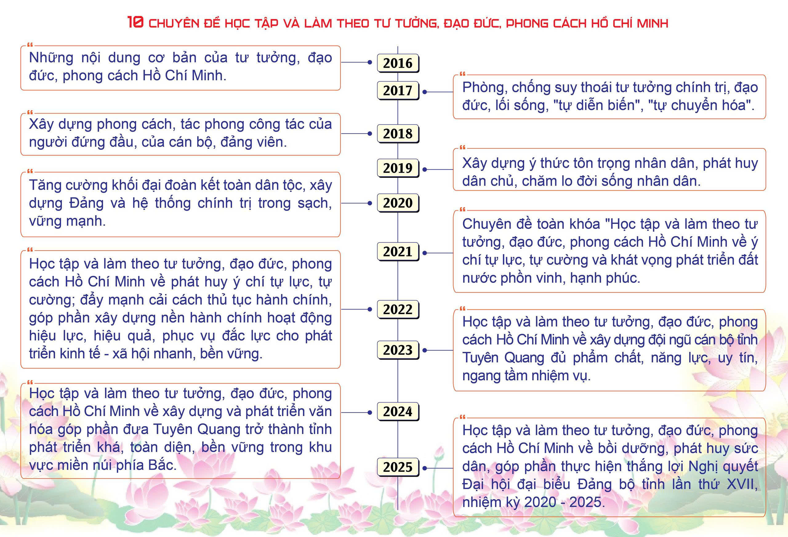 Việc nghiên cứu, quán triệt, triển khai Chỉ thị số 05-CT/TW, Kết luận số 01-KL/TW và chuyên đề toàn khóa, chuyên đề hằng năm có nhiều đổi mới. Các cấp ủy, tổ chức đảng đã tổ chức triển khai, quán triệt tới cán bộ, đảng viên, công chức, viên chức, đoàn viên, hội viên và tuyên truyền trong Nhân dân đảm bảo kịp thời, hiệu quả, nâng cao chất lượng với nhiều hình thức phong phú, đa dạng như: tổ chức các hội nghị bằng hình thức trực tiếp kết hợp trực tuyến; truyền hình trực tiếp trên báo Tuyên Quang online; ghi video nội dung học tập, triển khai tại hội nghị cấp tỉnh để phục vụ nghiên cứu, tuyên truyền ở cơ sở… Từ năm 2016 đến 2025, toàn tỉnh đã triển khai 10 chuyên đề học tập và làm theo tư tưởng, đạo đức, phong cách Hồ Chí Minh; trong đó, 6 chuyên đề theo chỉ đạo của Trung ương, 4 chuyên đề do Ban Thường vụ Tỉnh ủy chỉ đạo biên soạn. Nội dung các chuyên đề đều gắn với nhiệm vụ chính trị thực hiện Nghị quyết Đại hội đại biểu Đảng bộ tỉnh lần thứ XVII.
