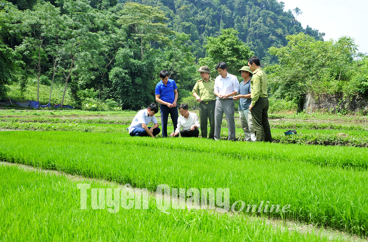 Cán bộ xã Thanh Tương (Na Hang) xuống giúp bà con thôn Bản Bung sản xuất lúa mùa.