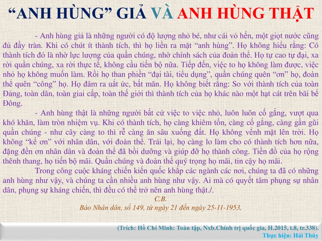 Trên Báo Nhân Dân số 149 từ ngày 21 đến 25-11-1953, với bút danh C.B, Chủ tịch Hồ Chí Minh đã viết bài: “Anh hùng giả và anh hùng thật”. Người nêu rõ: