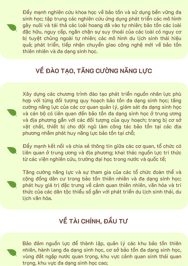 Ngày 08/11/2024, Thủ tướng Chính phủ ban hành Quyết định số 1352/QĐ-TTg phê duyệt quy hoạch bảo tồn đa dạng sinh học quốc gia thời kỳ 2021 - 2030, tầm nhìn đến năm 2050 với giải pháp như sau: