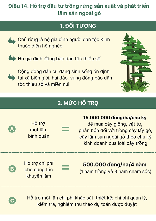 Ngày 24/5/2024, Chính phủ ban hành Nghị định số 58/2024/NĐ-CP về một số chính sách đầu tư trong lâm nghiệp, với một số chính sách về bảo vệ và phát triển rừng, chế biến lâm sản đối với rừng sản xuất quy định tại điều 12, 14, 15 như sau: