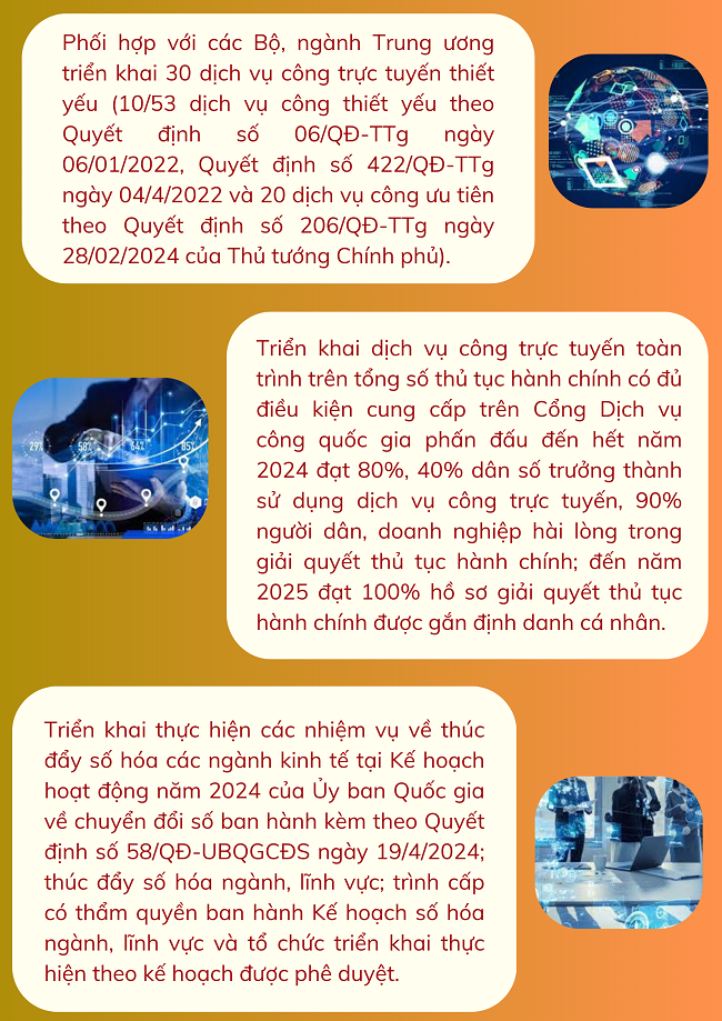 Ngày 05/8/2024 Ủy ban nhân dân tỉnh ban hành Văn bản số 3488/UBND-THCBKS về tổ chức thực hiện Thông báo kết luận Hội nghị sơ kết 6 tháng đầu năm 2024 về chuyển đổi số quốc gia và Đề án 06 của Chính phủ, với một số nhiệm vụ như sau: