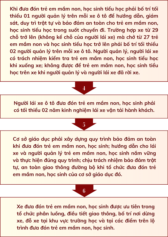 Ngày 27/6/2024, Chính phủ ban hành Luật số 36/2024/QH15 trật tự an toàn, giao thông đường bộ; quy định bảo đảm trật tự, an toàn giao thông đường bộ đối với xe ôtô chở trẻ em mầm non, học sinh tại Điều 46 như sau: