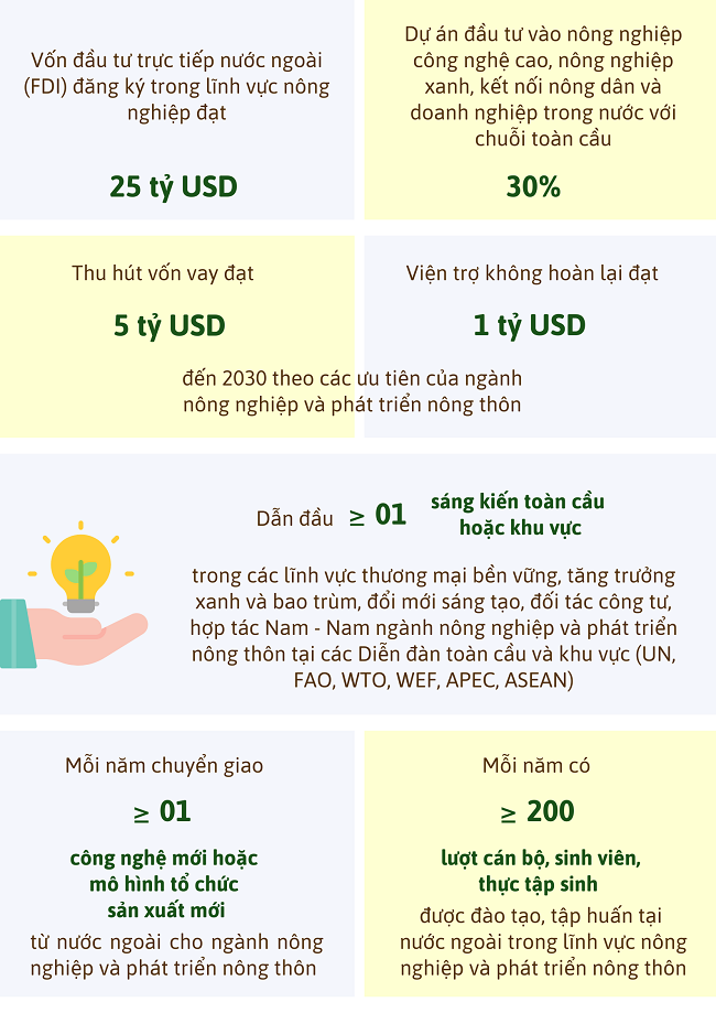 Mục tiêu, một số nhiệm vụ, giải pháp trọng tâm thực hiện đề án thúc đẩy hợp tác quốc tế và hội nhập kinh tế quốc tế trong nông nghiệp và pháp triển nông thôn đến năm 2030, tầm nhìn đến năm 2050