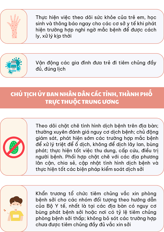 Ngày 14/11/2024, Thủ tướng Chính phủ ban hành Công điện 116/CĐ-TTg về việc tăng cường công tác phòng, chống bệnh sởi với nhiệm vụ, giải pháp như sau: