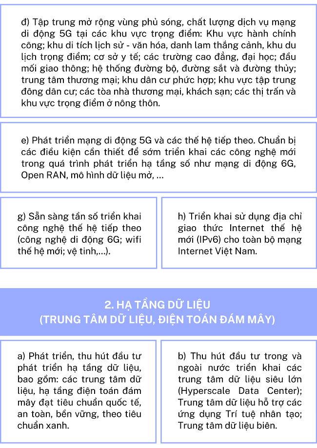 Ngày 09/10/2024, Thủ tướng Chính phủ ban hành Quyết định số 1132/QĐ-TTg về phê duyệt Chiến lược hạ tầng số đến năm 2025 và định hướng đến năm 2030 với nhiệm vụ trọng tâm như sau: