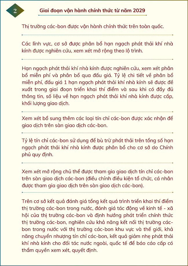 Ngày 24/01/2025, Thủ tướng Chính phủ ban hành Quyết định số 232/QĐ-TTg về phê duyệt Đề án thành lập và phát triển thị trường các-bon tại Việt Nam, với quan điểm, nguyên tắc, mục tiêu, lộ trình như sau: