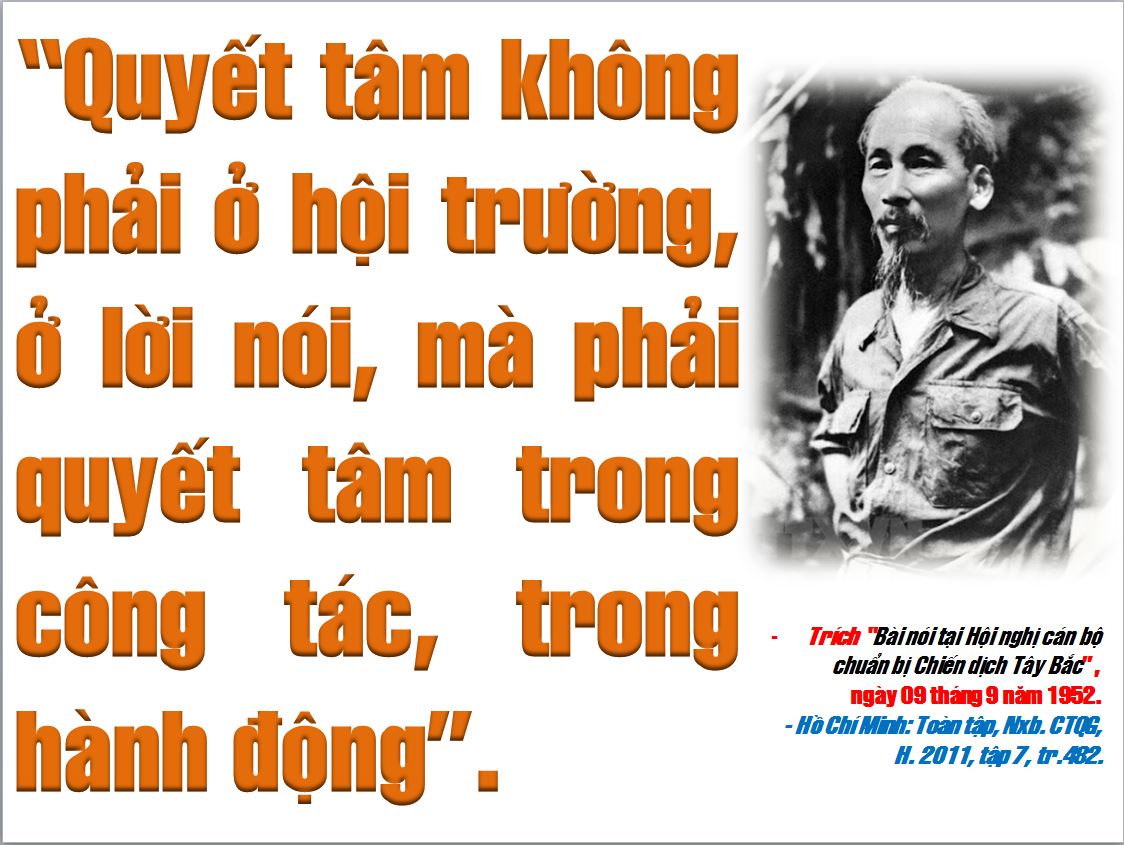 Phải quyết tâm chiến đấu, quyết tâm chịu khổ chịu khó, quyết tâm khắc phục mọi khó khăn, quyết tâm chấp hành chính sách của Trung ương Đảng và Chính phủ. Nghĩa là trong thái độ, trong tư tưởng, trong hành động, trong chiến đấu, bất kỳ một việc lớn hay nhỏ đều phải có quyết tâm làm cho bằng được.