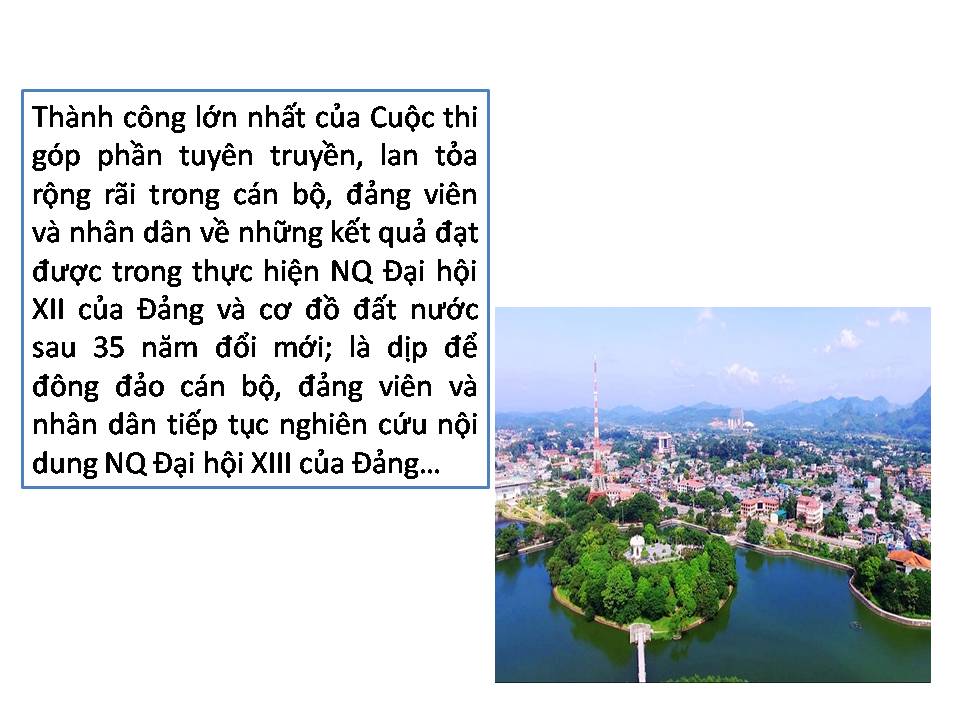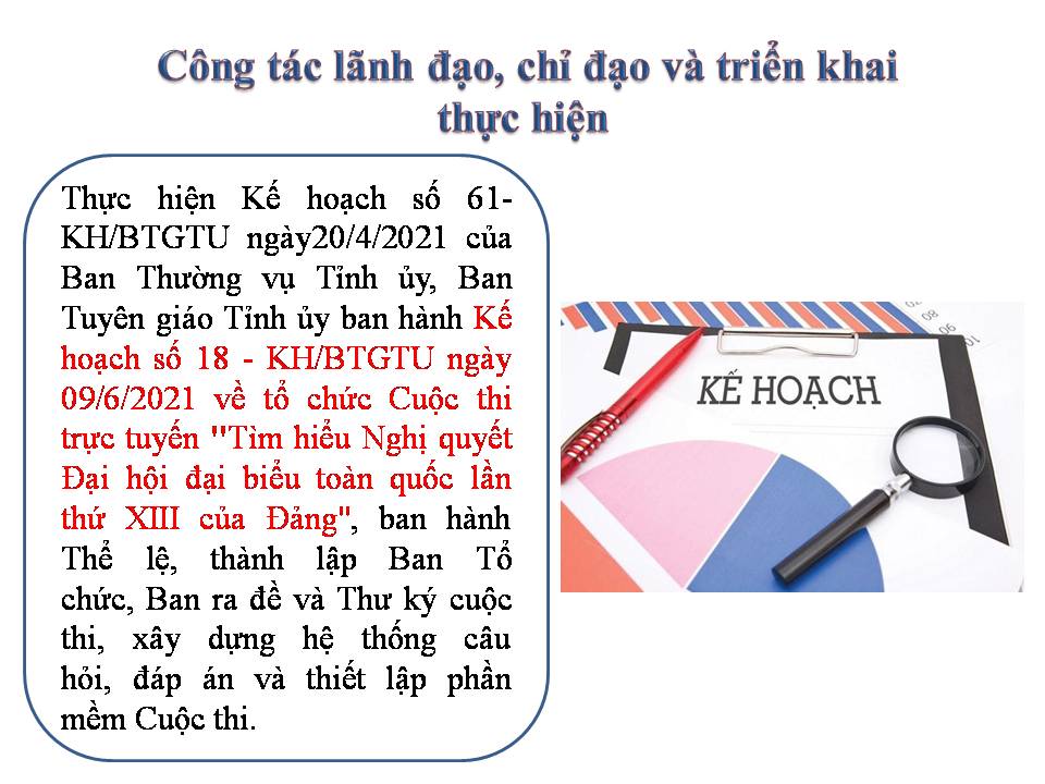 Để nhanh chóng đưa Nghị quyết Đại hội XIII của Đảng vào cuộc sống, Ban Tuyên giáo Tỉnh ủy Tuyên Quang đã có những việc làm cụ thể, thiết thực, trong đó, đã tổ chức thành công Cuộc thi trực tuyến "Tìm hiểu Nghị quyết Đại hội đại biểu toàn quốc lần thứ XIII của Đảng". Qua 01 tháng triển khai (từ 01/7/2021 đến ngày 30/7/2021), cuộc thi đã đạt được một số kết quả quan trọng, góp phần tuyên truyền tới cán bộ, đảng viên và Nhân dân về những kết quả đạt được trong thực hiện Nghị quyết Đại hội XII, cơ đồ đất nước sau 35 năm đổi mới, những nội dung cơ bản, cốt lõi về tầm nhìn, định hướng phát triển đất nước, các quan điểm chỉ đạo, mục tiêu chủ yếu, nhiệm vụ trọng tâm và đột phá chiến lược trong nhiệm kỳ Đại hội XIII của Đảng.