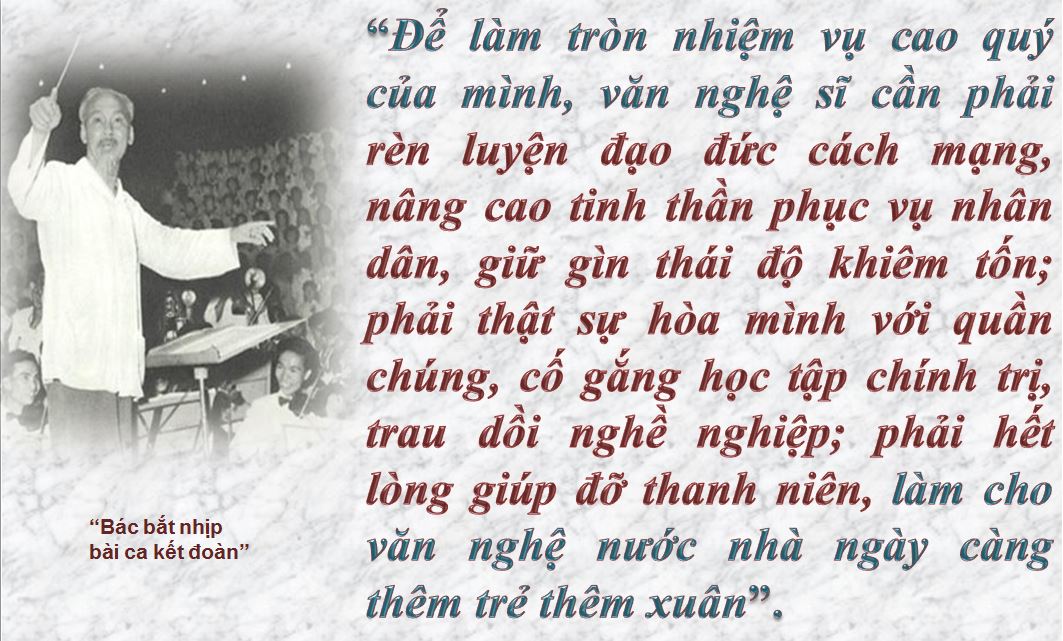 Là người đặt nền móng cho nền văn học nghệ thuật cách mạng, Chủ tịch Hồ Chí Minh thường xuyên sâu sát và chỉ bảo tận tình, trách nhiệm đối với đội ngũ những người làm công tác văn hóa văn nghệ. Ngày 1-12-1962, nói chuyện tại Đại hội Văn nghệ toàn quốc lần thứ III, Người nêu rõ: "Rõ ràng là dân tộc bị áp bức, thì văn nghệ cũng mất tự do. Văn nghệ muốn tự do thì phải tham gia cách mạng... Quần chúng đang chờ đợi những tác phẩm văn nghệ xứng đáng với thời đại vẻ vang của chúng ta, những tác phẩm ca tụng chân thật những người mới, việc mới chẳng những để làm gương mẫu cho chúng ta ngày nay, mà còn để giáo dục con cháu ta đời sau..". Người căn dặn: