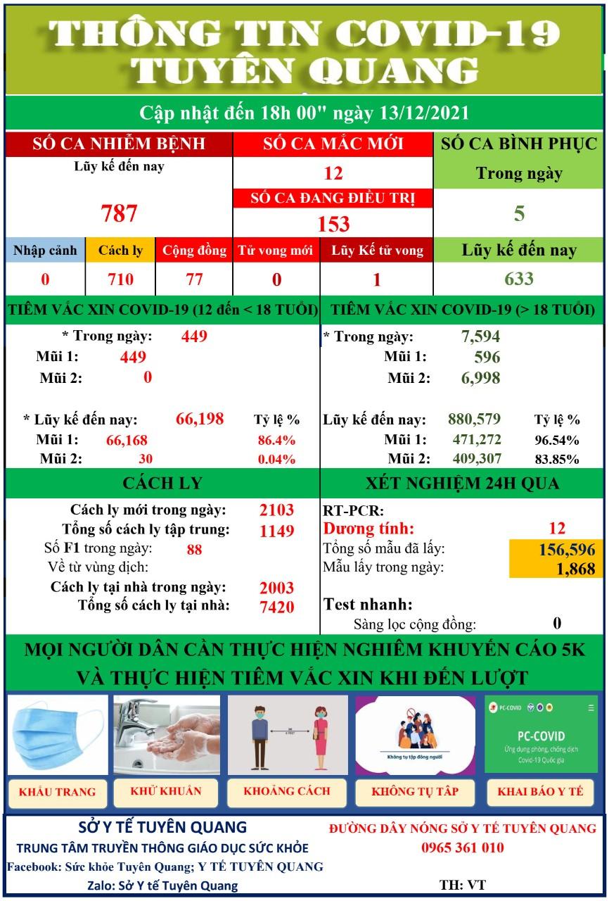 BCĐ phòng chống dịch COVID-19 Sở Y tế cung cấp thông tin dịch bệnh COVID-19 và tiêm chủng vắc xin COVID-19 trên địa bàn tỉnh Tuyên Quang (số liệu cập nhật đến 18h 00" ngày 13/12/2021).