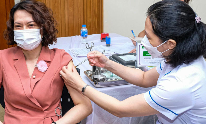 Thứ trưởng Bộ Y tế Nguyễn Thị Liên Hương đã tiêm mũi 4 vắc xin phòng Covid-19 ngay tại lễ phát động diễn ra sáng 5-7.