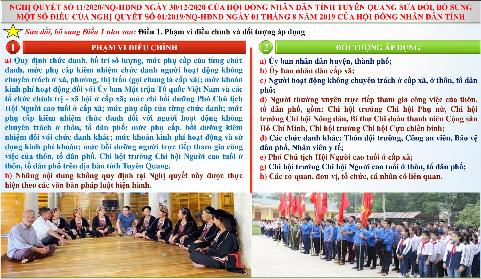 Tại kỳ họp chuyên đề ngày 24/12/2020, Hội đồng nhân dân tỉnh đã thông qua Nghị quyết Sửa đổi, bổ sung một số điều của Nghị quyết số 01/2019/NQ-HĐND ngày 01/8/2019 của HĐND tỉnh quy định chức danh, bố trí số lượng, mức phụ cấp đối với người hoạt động không chuyên trách ở xã, phường, thị trấn; mức khoán kinh phí hoạt động đối với Ủy ban Mặt trận Tổ quốc Việt Nam và các tổ chức chính trị - xã hội ở xã, phường, thị trấn; mức phụ cấp đối với người hoạt động không chuyên trách và mức bồi dưỡng người trực tiếp tham gia công việc của thôn, tổ dân phố trên địa bàn tỉnh Tuyên Quang.