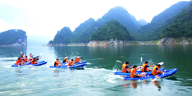 Khách du lịch trải nghiệm bơi thuyền Kayak trên lòng hồ thủy điện Tuyên Quang.