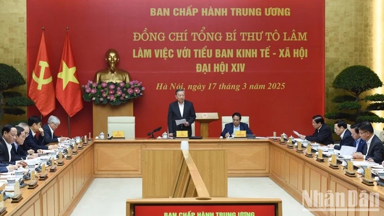 Sáng 17/3, tại Trụ sở Chính phủ, Tổng Bí thư Tô Lâm chủ trì buổi làm với Tiểu ban Kinh tế-Xã hội Đại hội lần thứ XIV của Đảng. Đồng chí Phạm Minh Chính, Ủy viên Bộ Chính trị, Thủ tướng Chính phủ, Trưởng Tiểu ban Kinh tế-Xã hội đồng chủ trì; cùng dự có các đồng chí Ủy viên Bộ Chính trị, Bí thư Trung ương Đảng, Phó Thủ tướng Chính phủ; lãnh đạo các bộ, ban, ngành, cơ quan Trung ương là thành viên Tiểu ban, Thường trực Tổ Biên tập của Tiểu ban.