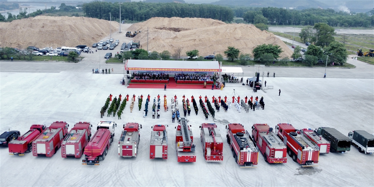 Cuộc diễn tập huy động nhiều lực lượng với 600 người, cùng 35 xe chuyên dụng các loại. Phần diễn tập thực binh theo tình huống giả định, xảy ra cháy tại phân xưởng giấy, Công ty cổ phần Giấy An Hòa do hệ thống điện bị chập, phát sinh các tia lửa điện bắn vào khu vực để giấy thành phẩm, đám cháy đã nhanh chóng lan rộng. Do tác động của ngọn lửa, nhiệt độ cao, khói khí độc và đám cháy phát triển nhanh khiến nhiều công nhân viên bị thương và mắc kẹt. Phần diễn tập được tiến hành qua 4 giai đoạn với các phương án xử lý tình huống cụ thể gồm: Giai đoạn 1 là lực lượng PCCC cơ sở và Đội PCCC chuyên ngành phát huy phương châm “4 tại chỗ” hướng dẫn thoát nạn, cứu người, cứu tài sản và tổ chức chữa cháy. Giai đoạn 2: Lực lượng Cảnh sát PCCC và cứu nạn, cứu hộ gần nhất và chính quyền địa phương tìm kiếm người bị nạn và ngăn chặn không để cháy lan, lực lượng chữa cháy chuyên nghiệp Phòng Cảnh sát PCCC và cứu nạn cứu hộ đến chi viện chữa cháy, cứu nạn, cứu hộ. Giai đoạn 3 là các đơn vị nghiệp vụ thuộc Công an tỉnh đến tham gia hỗ trợ công tác chữa cháy và cứu nạn, cứu hộ. Giai đoạn 4 là phát huy sức mạnh tổng hợp, đồng bộ giữa các đơn vị chữa cháy và cứu nạn, cứu hội tổ chức tìm kiếm nạn nhân, cấp cứu, tổ chức điều tra và khắc phục hậu quả vụ cháy.