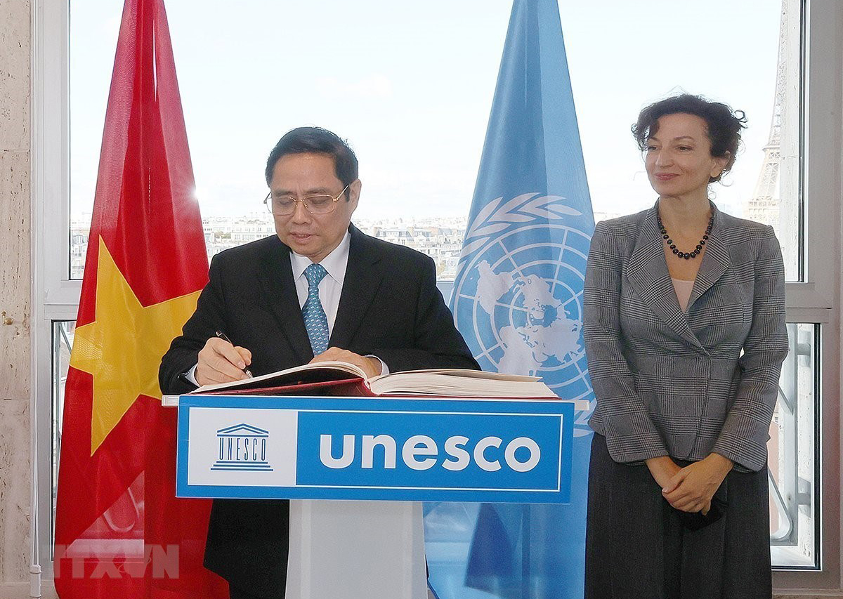 Ủy viên Bộ Chính trị, Thủ tướng Chính phủ Phạm Minh Chính viết sổ lưu bút tại trụ sở UNESCO ở Thủ đô Paris (Pháp)_Ảnh: TTXVN