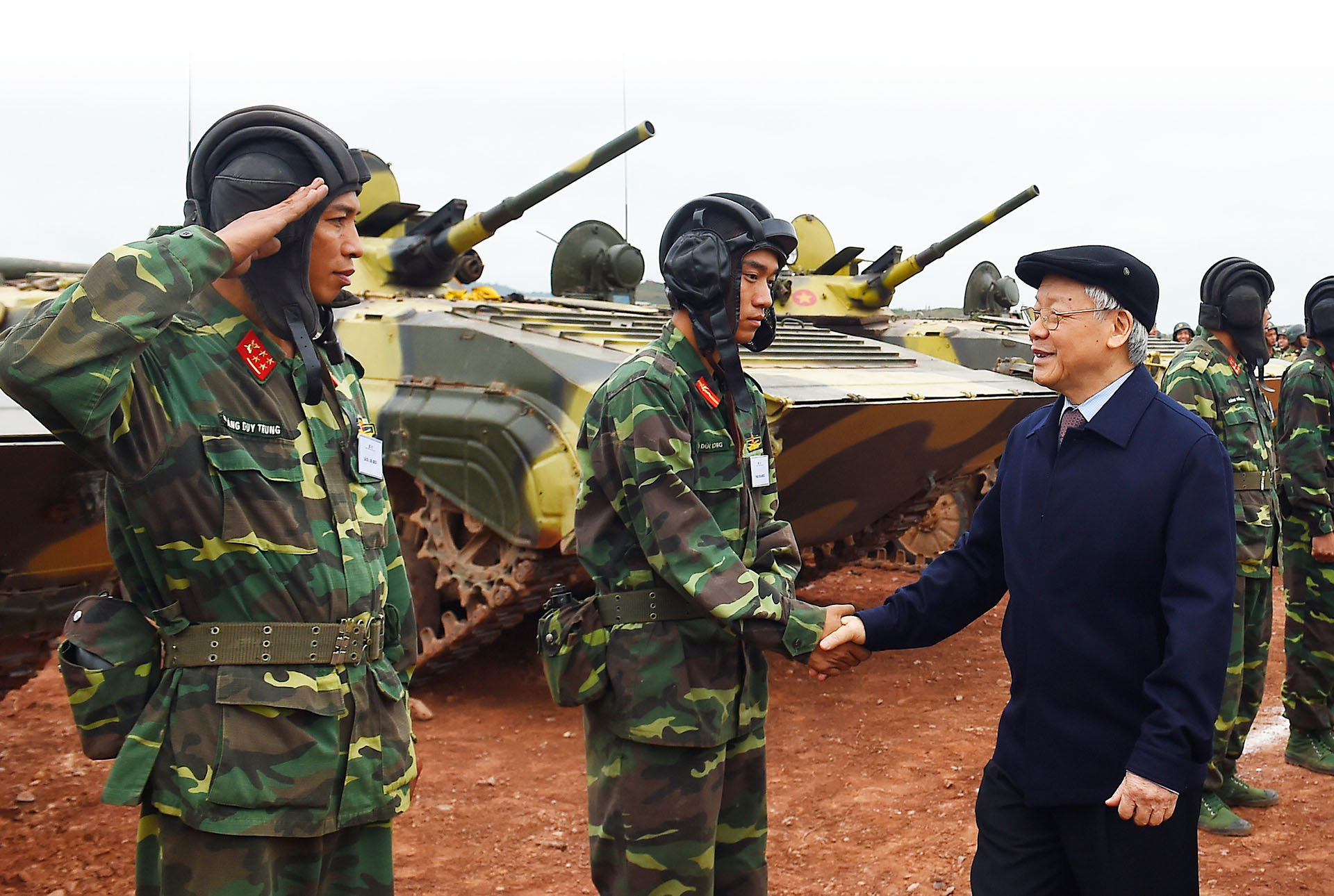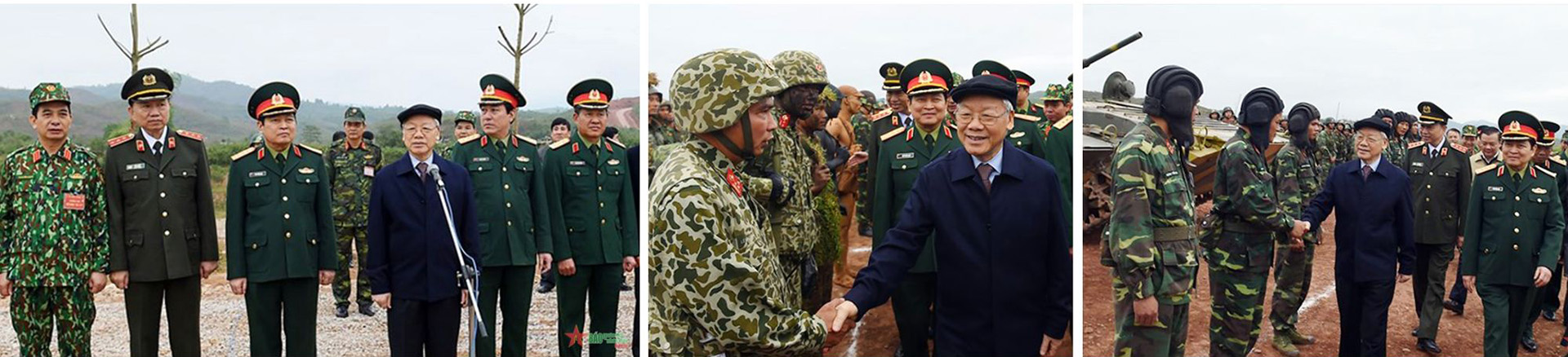 Tổng Bí thư, Bí thư Quân ủy Trung ương Nguyễn Phú Trọng thăm, kiểm tra công tác huấn luyện, hiệp đồng, sẵn sàng chiến đấu của một số đơn vị Quân đội tại trường bắn TB1, Bắc Giang, ngày 19-11-2017. Ảnh: TRỌNG HẢI