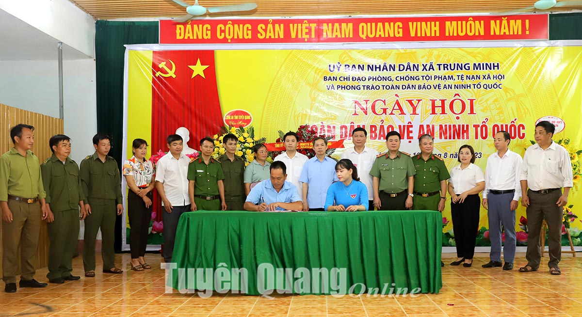 Các đồng chí lãnh đạo tỉnh, lãnh đạo Công an tỉnh và huyện Yên Sơn chứng kiến ký kết giao ước thi đua thực hiện phong trào “Toàn dân bảo vệ an ninh Tổ quốc” tại Trung Minh.