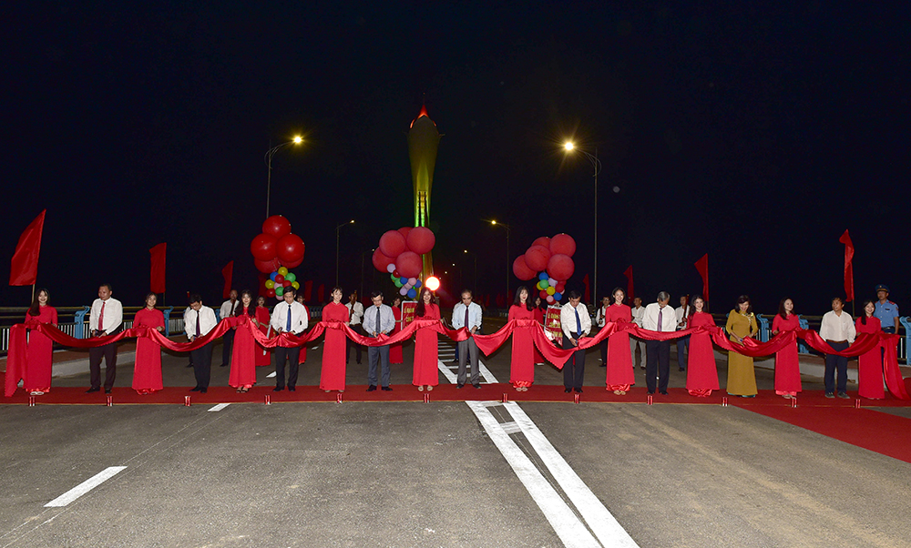 Các đồng chí lãnh đạo tỉnh và đại biểu cắt băng cắt khánh thành cầu Tình Húc.  Ảnh: Thành Công