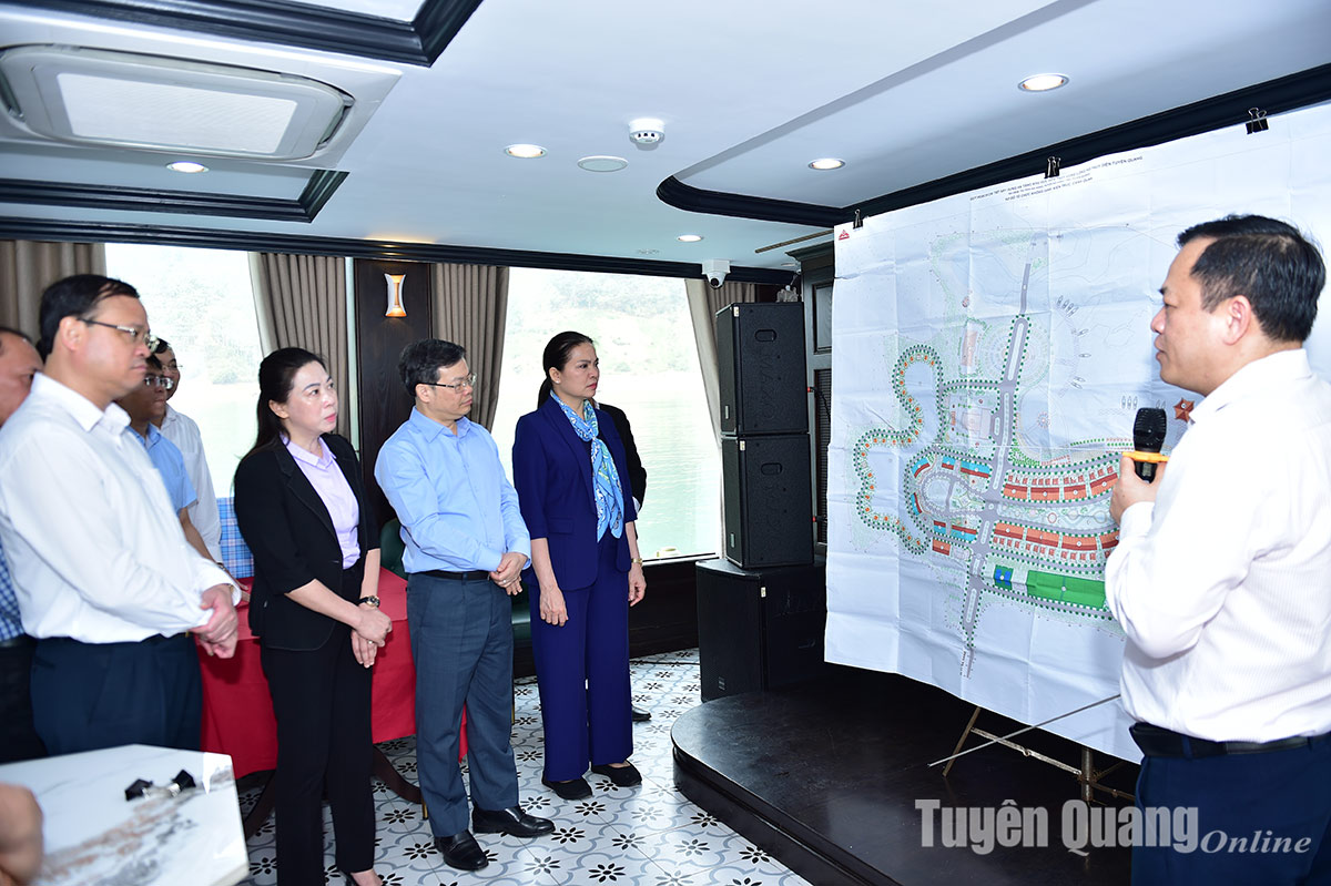 Các đồng chí lãnh đạo tỉnh nắm tình hình quy hoạch chi tiết khu vực bến thủy thị trấn Na Hang.