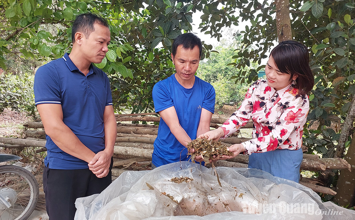 Anh Nguyễn Văn Hoan (giữa), Tổ dân phố Hồng Thái, thị trấn Yên Sơn ủ phụ phẩm cây trồng làm thức ăn cho bò.