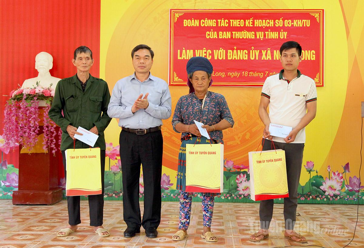 | Đồng chí Phó Bí thư Tỉnh ủy Ma Thế Hồng tặng quà cho 3 gia đình cựu chiến binh xã Ngọc Long. |