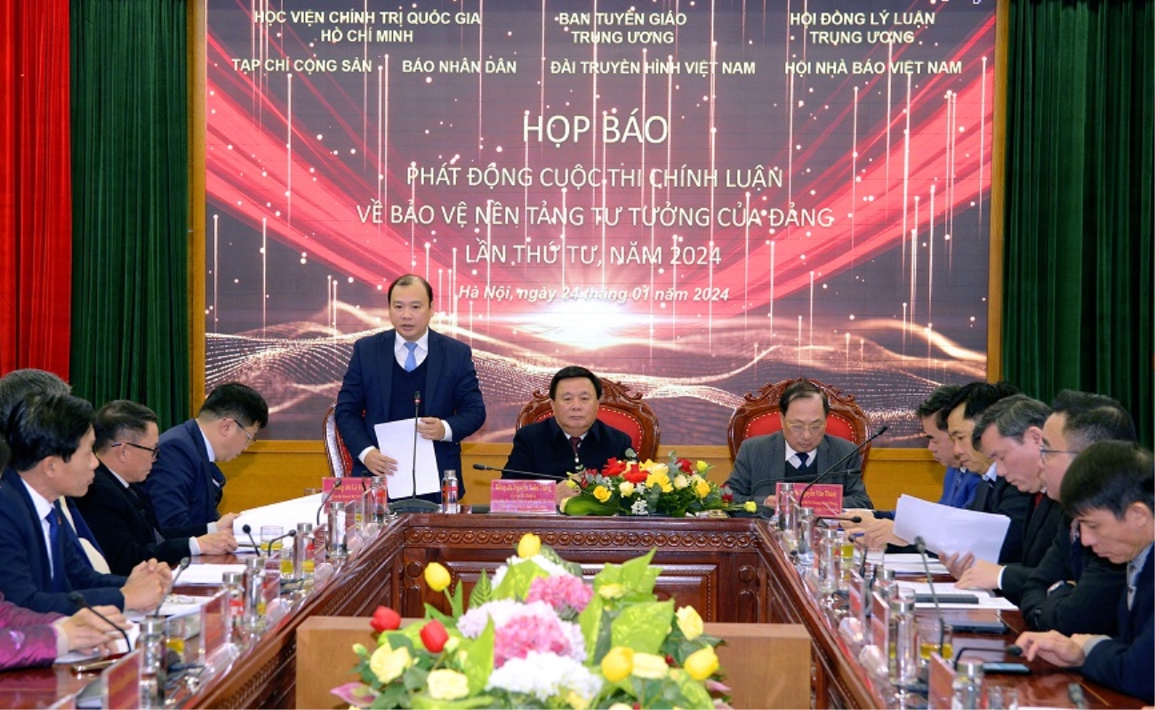 Học viện Chính trị quốc gia Hồ Chí Minh chủ trì, phối hợp cùng Ban Tuyên giáo Trung ương, Hội đồng Lý luận Trung ương, Tạp chí Cộng sản, Báo Nhân dân, Đài Truyền hình Việt Nam và Hội Nhà báo Việt Nam tổ chức họp báo phát động “Cuộc thi chính luận về bảo vệ nền tảng tư tưởng của Đảng lần thứ tư, năm 2024” (Nguồn: dangcongsan.vn)