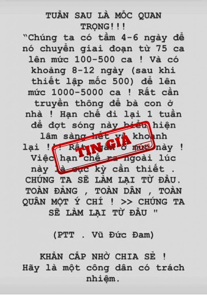 Ngày 6/8, Trung tâm Xử lý Tin giả Việt Nam (VAFC), thuộc Cục Phát thanh, truyền hình và thông tin điện tử, Bộ Thông tin và Truyền thông, thông báo một phát ngôn giả mạo chỉ đạo chống dịch của Phó Thủ tướng Vũ Đức Đam.