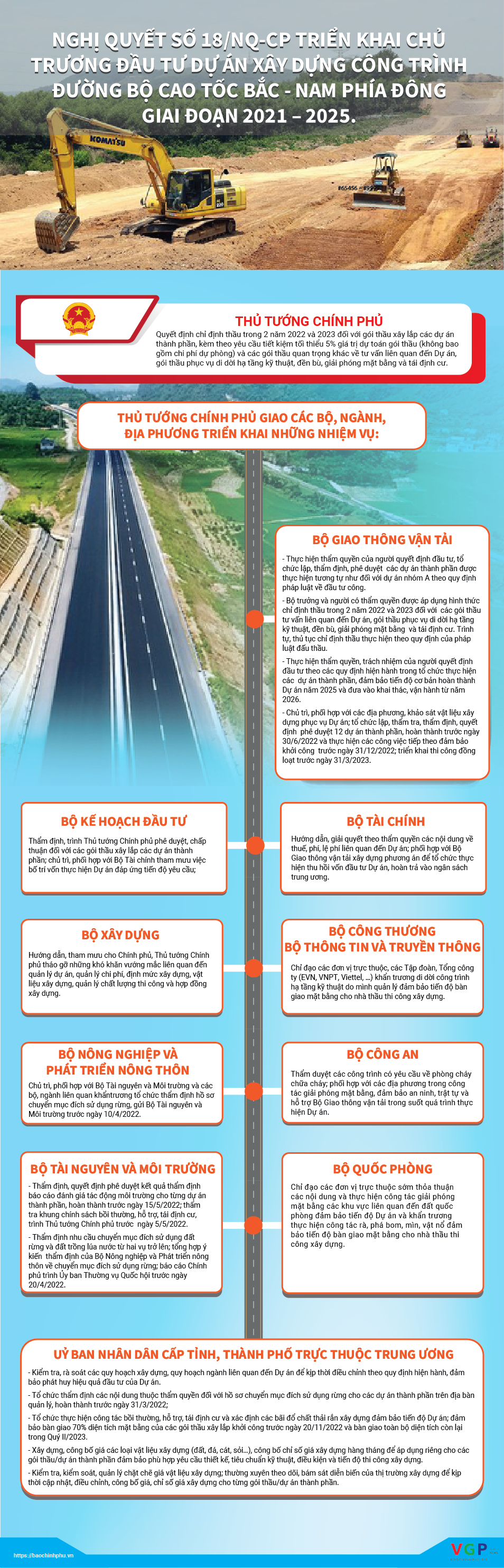Ngày 11/2, Chính phủ ban hành Nghị quyết số 18/NQ-CP triển khai Nghị quyết số 44/2022/QH15 ngày 11/1/2022 của Quốc hội về chủ trương đầu tư Dự án xây dựng công trình đường bộ cao tốc Bắc-Nam phía đông giai đoạn 2021-2025.